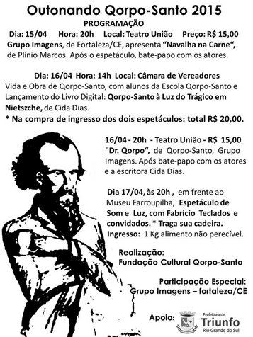 Realização da 1ª Távola Cultural do Tryumpho de Qorpo-Santo A "1ª Távola Cultural de Qorpo- Santo" realizada, em 19 de abril de 2016 com a presença do professor e escritor Antonio de Assis Brasil, da profressora e diretora de teatro Inês Môrocco, do primeiro diretor das peças de Qorpo-Santo Antonio Carlos Cena, da pesquisadora da vida e obra literária e dramatúrgica de QS, Maria Clara Gonçalves, da arte educadora e escritora Cida Dias e também das trinetas de QS Adi e Eloah Ventura trineta de Qorpo-Santo.